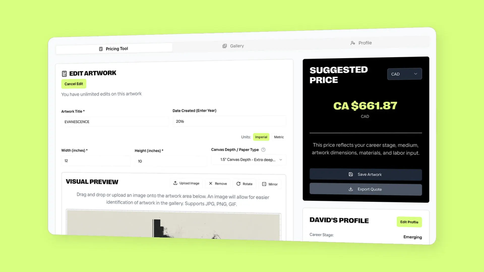 Get transparent, artist-first pricing. Start free to price your first piece with real global market data, then upgrade anytime for unlimited saves, exports, and growth tools.