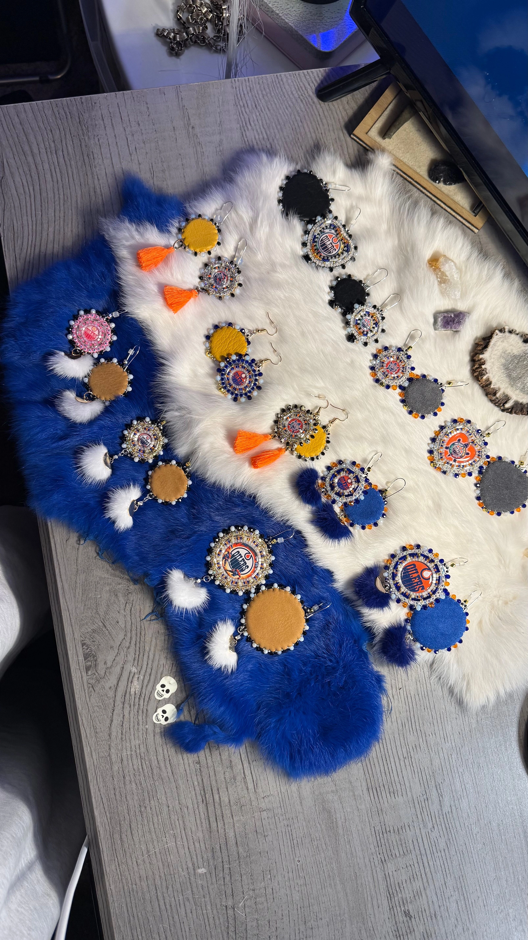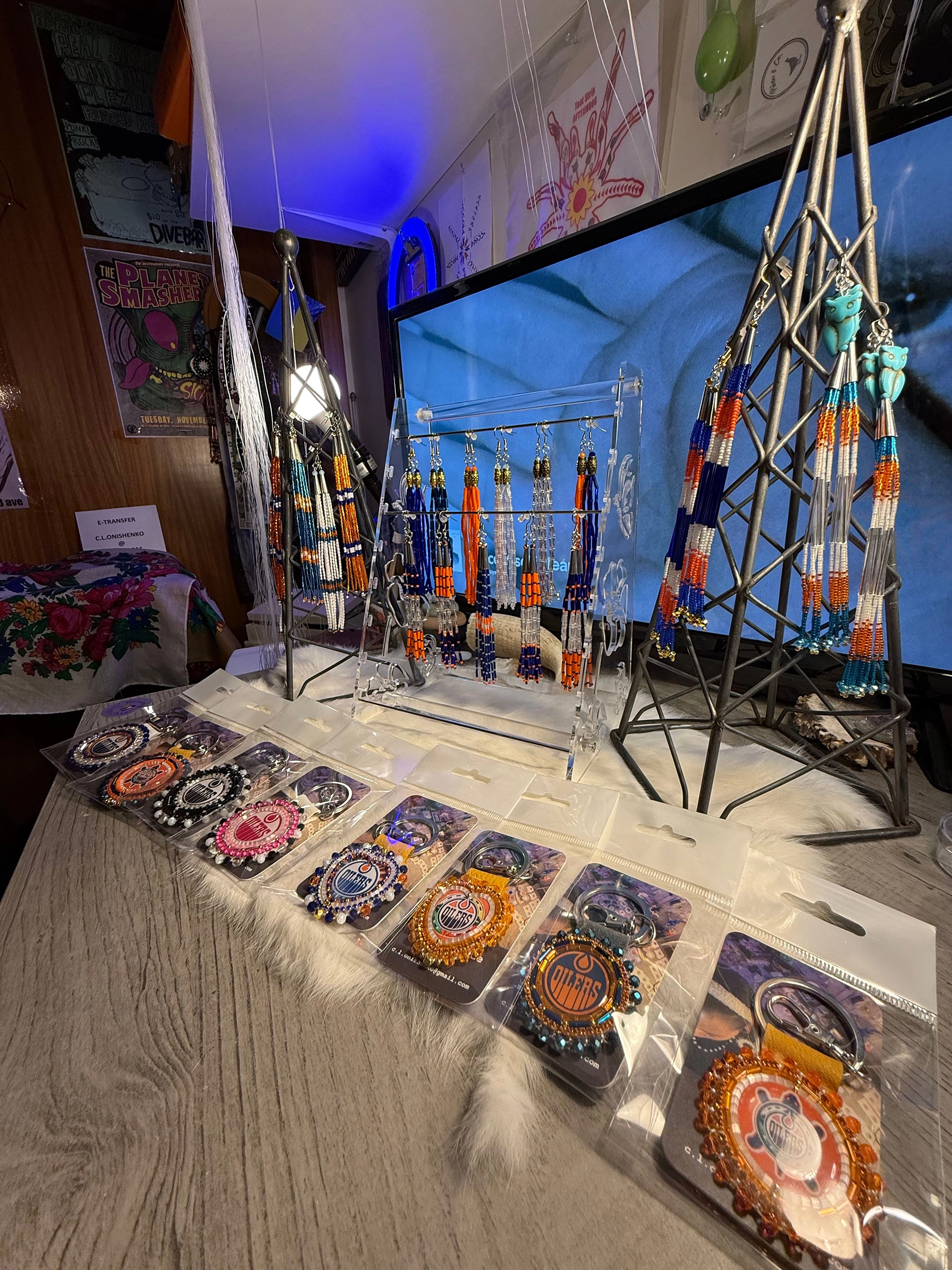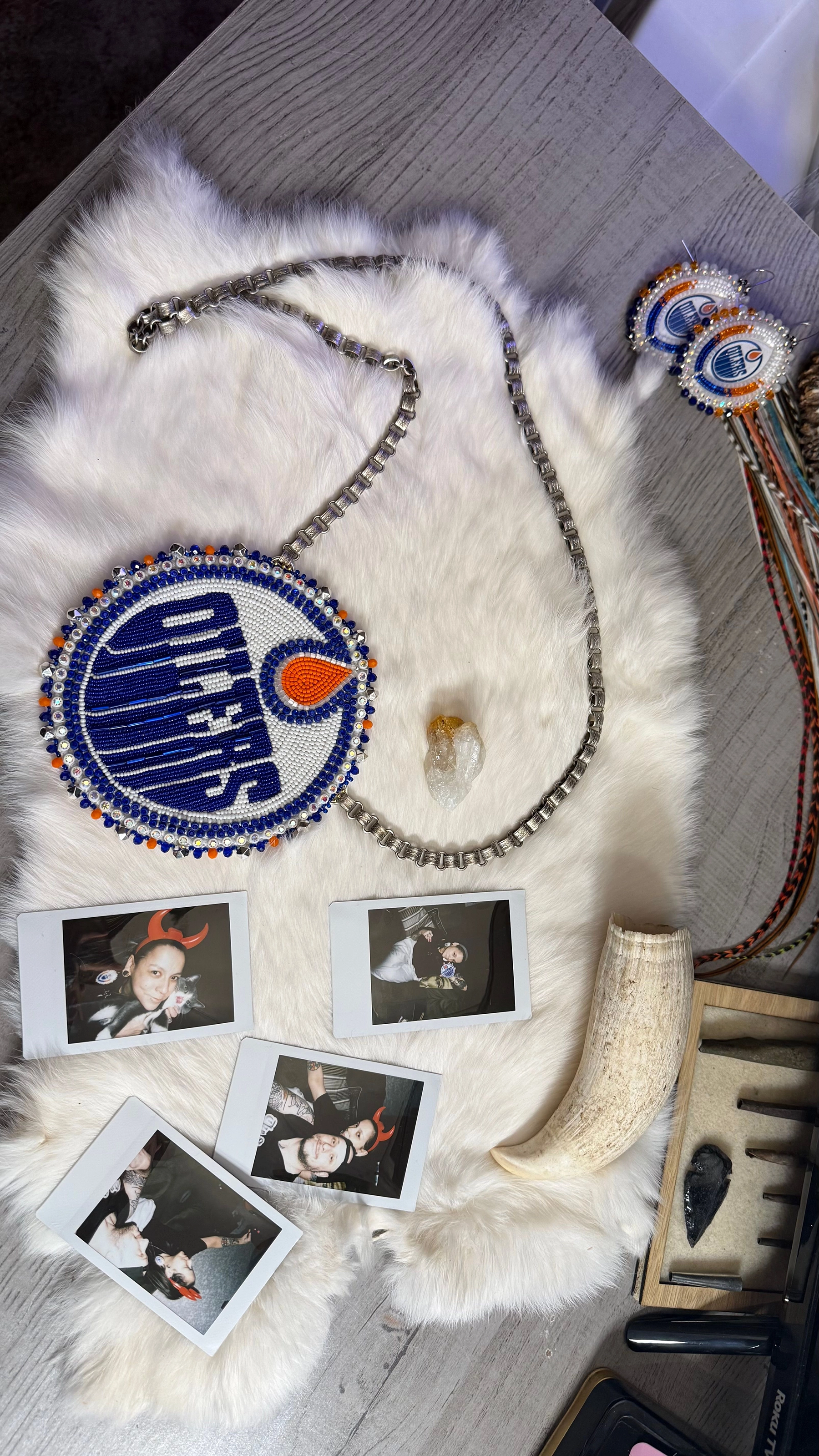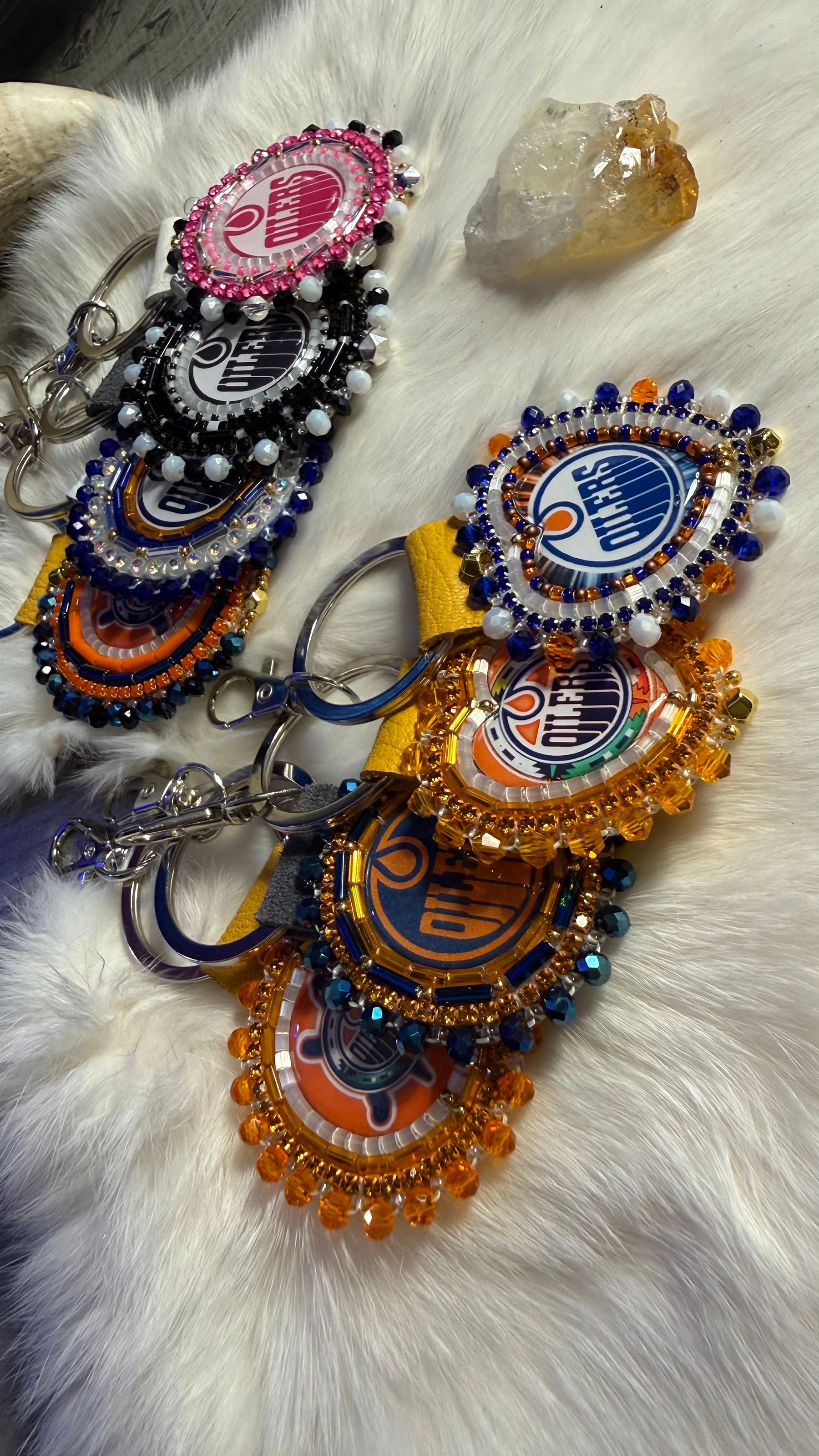 My name is Cheryl, I’m an indigenous artist, I’ve been beading for about 5 years now, I bead unique custom pieces, and value the representational side of my work. I love learning more about my heritage, and myself through my artwork & applying it with the work I do, I love telling stories with different types of beads, I work with feathers, all different types of beads, gemstones, shells, jingle cones, porcupine quills and more. From traditional styles to modern, modest to exciting, I also love working on pop culture pieces & sports items, for example Oilers items. I dream to build regalia in the future.