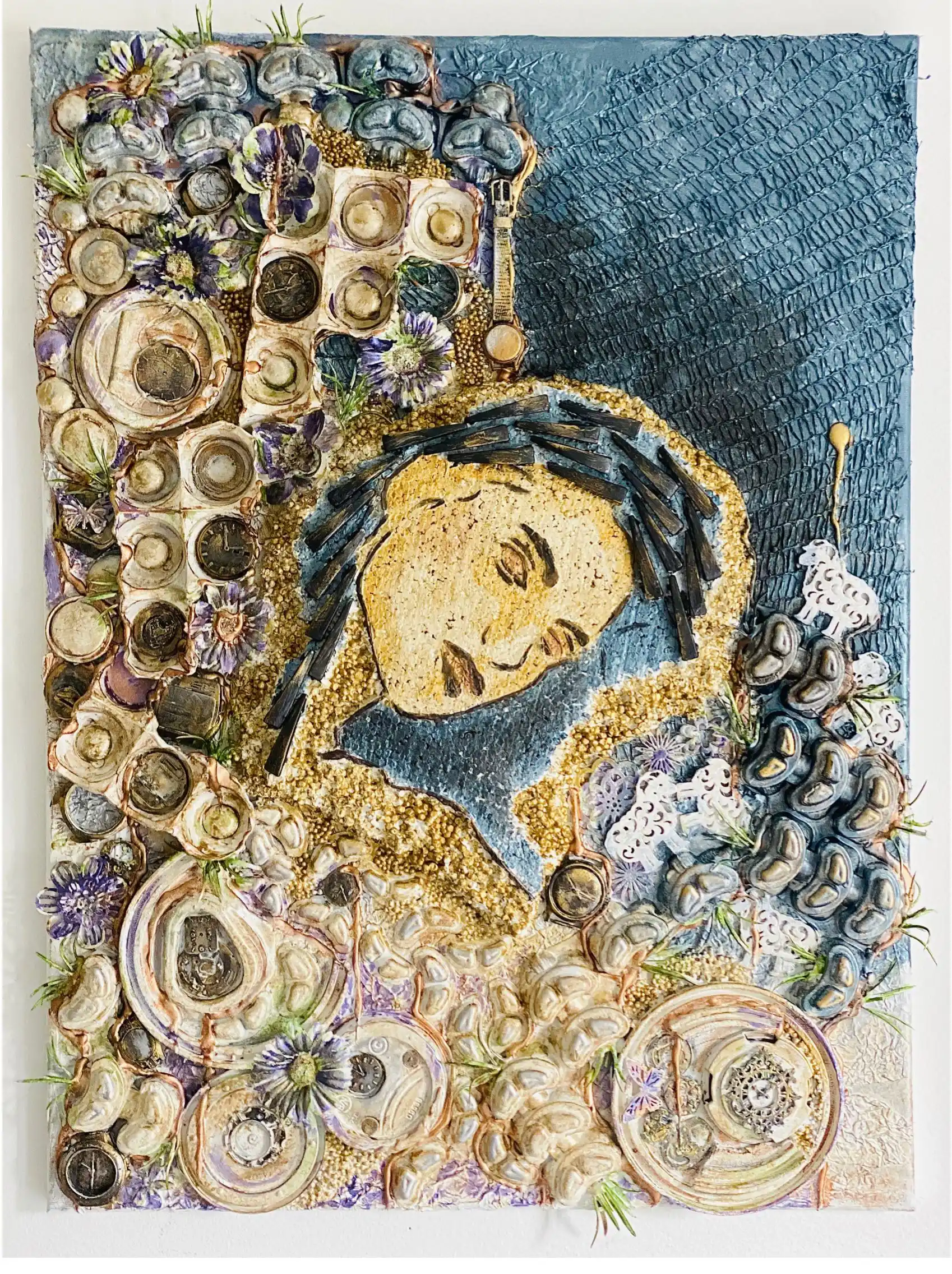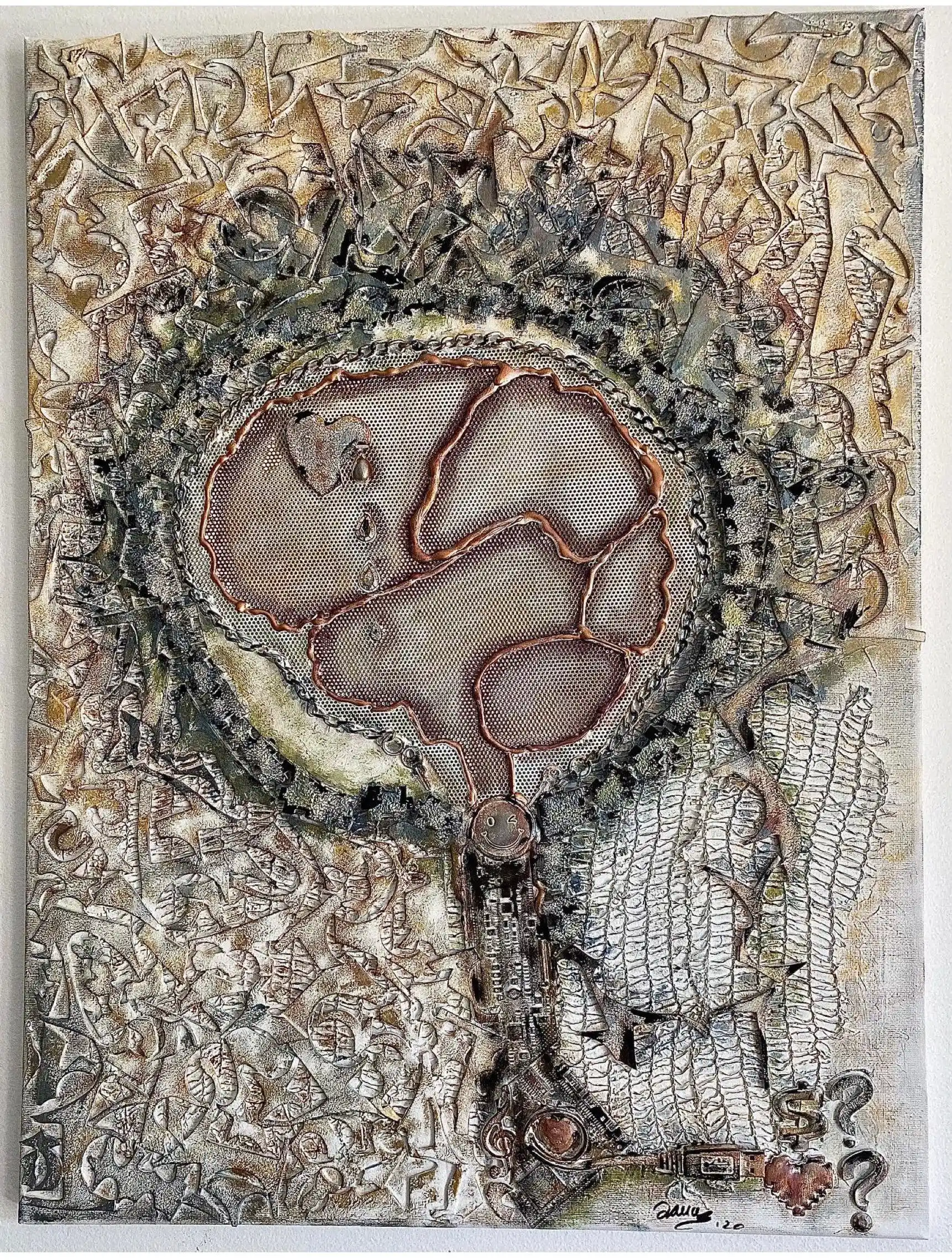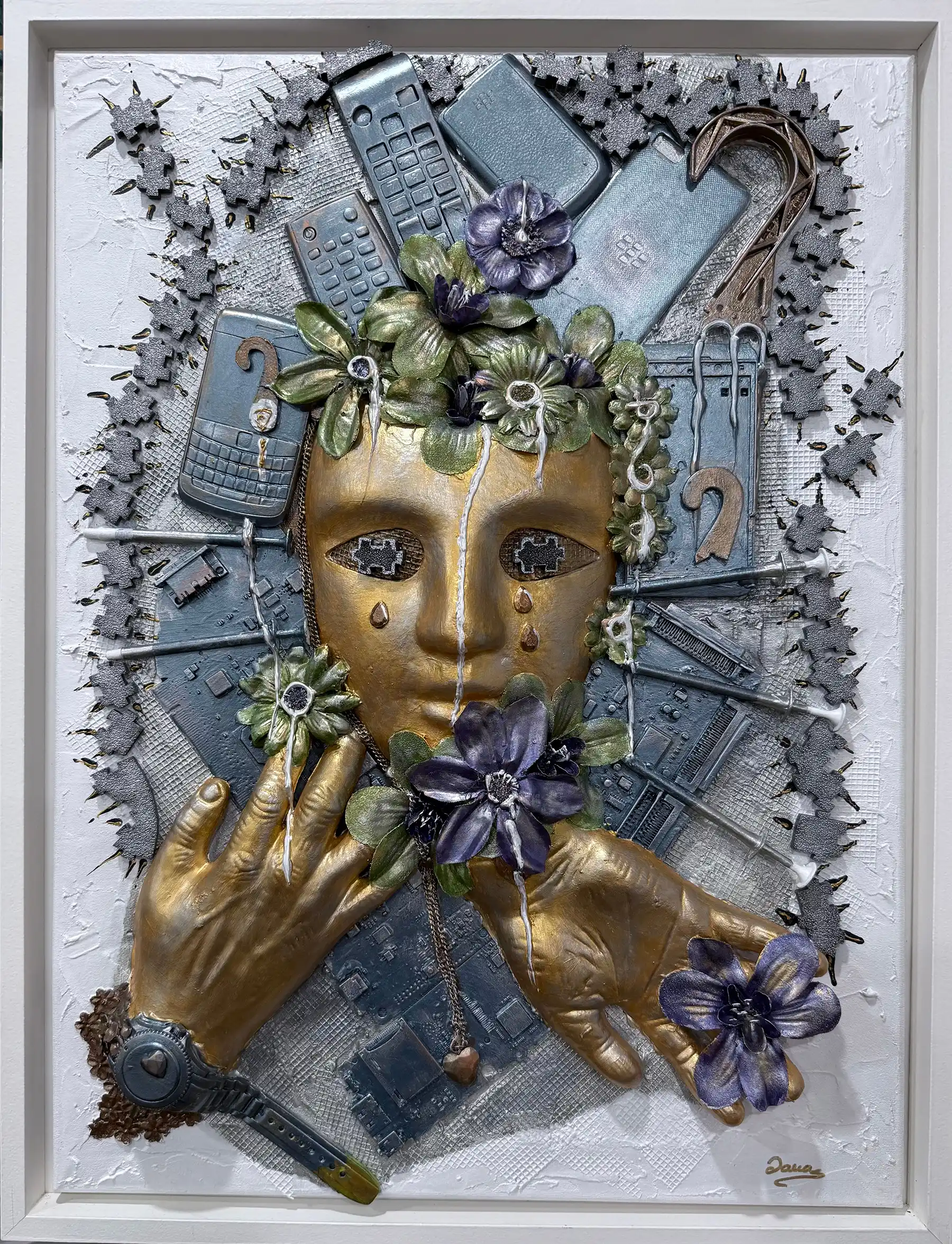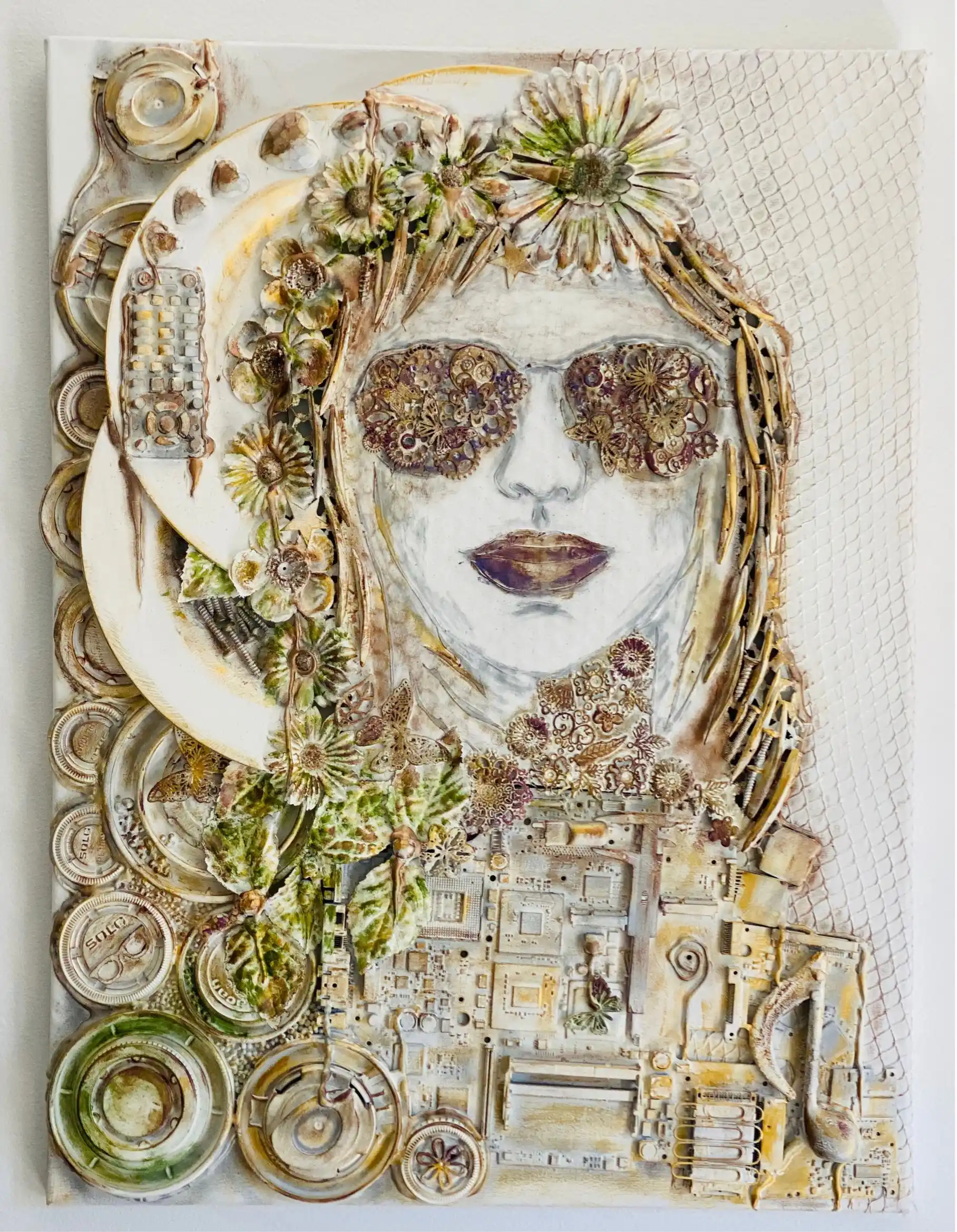 I am an engineer by training turned visual artist. Working primarily with mixed media, I create three-dimensional installations on canvas using upcycled and repurposed materials such as recycled plastics, discarded computer components, old jewellery, and textiles. My work explores the intersection of technology, environment, and the human mind. I construct layered narratives that question our relationship with technological progress and its impact on nature and human experience.