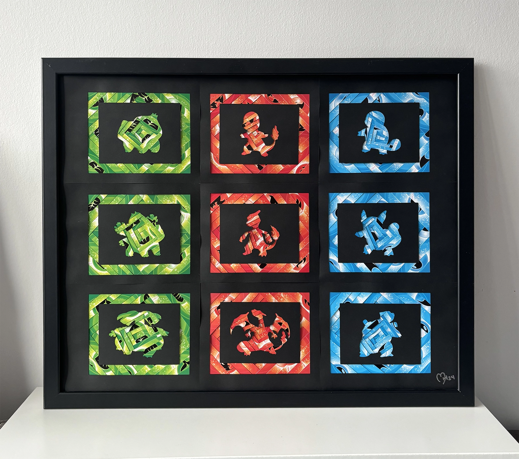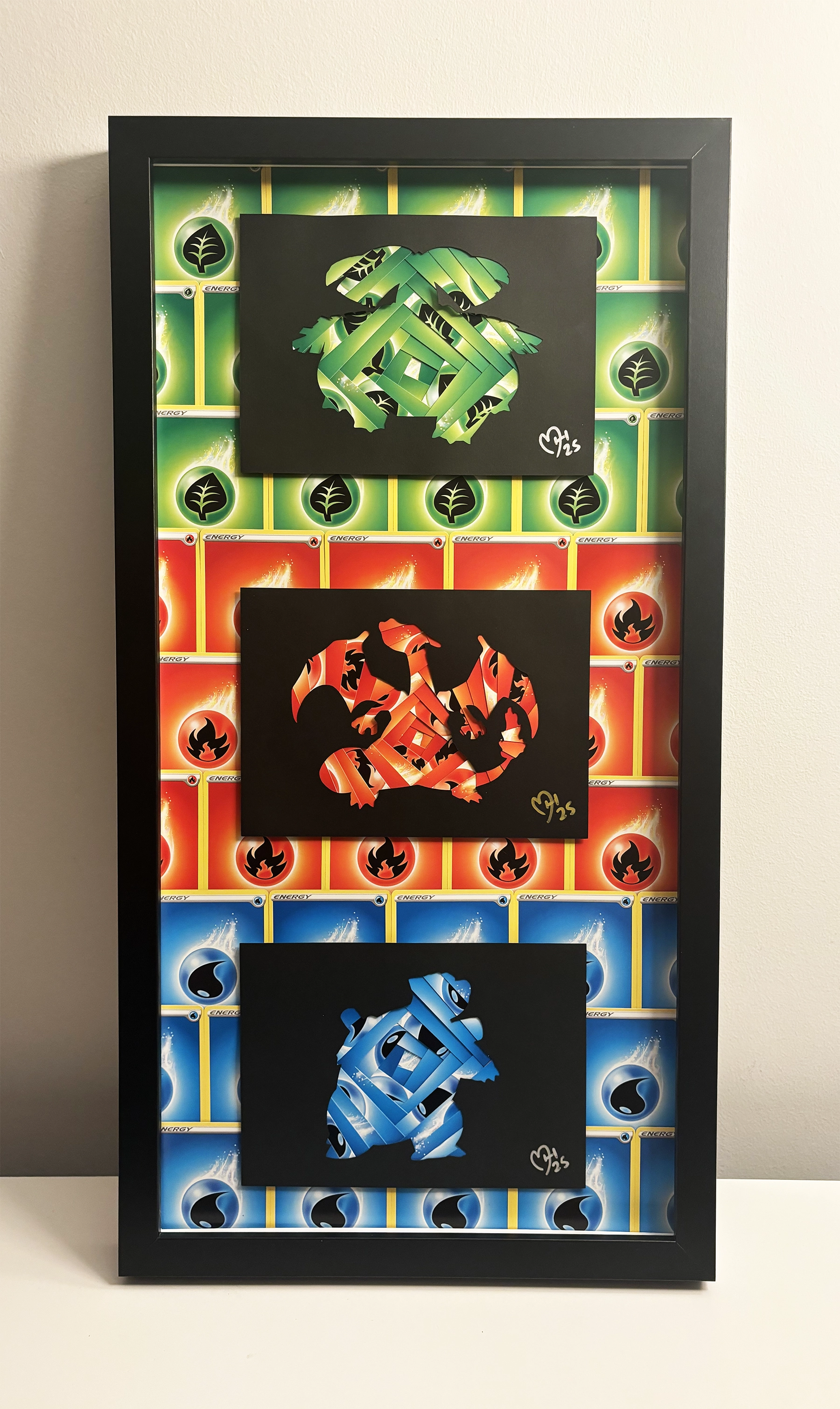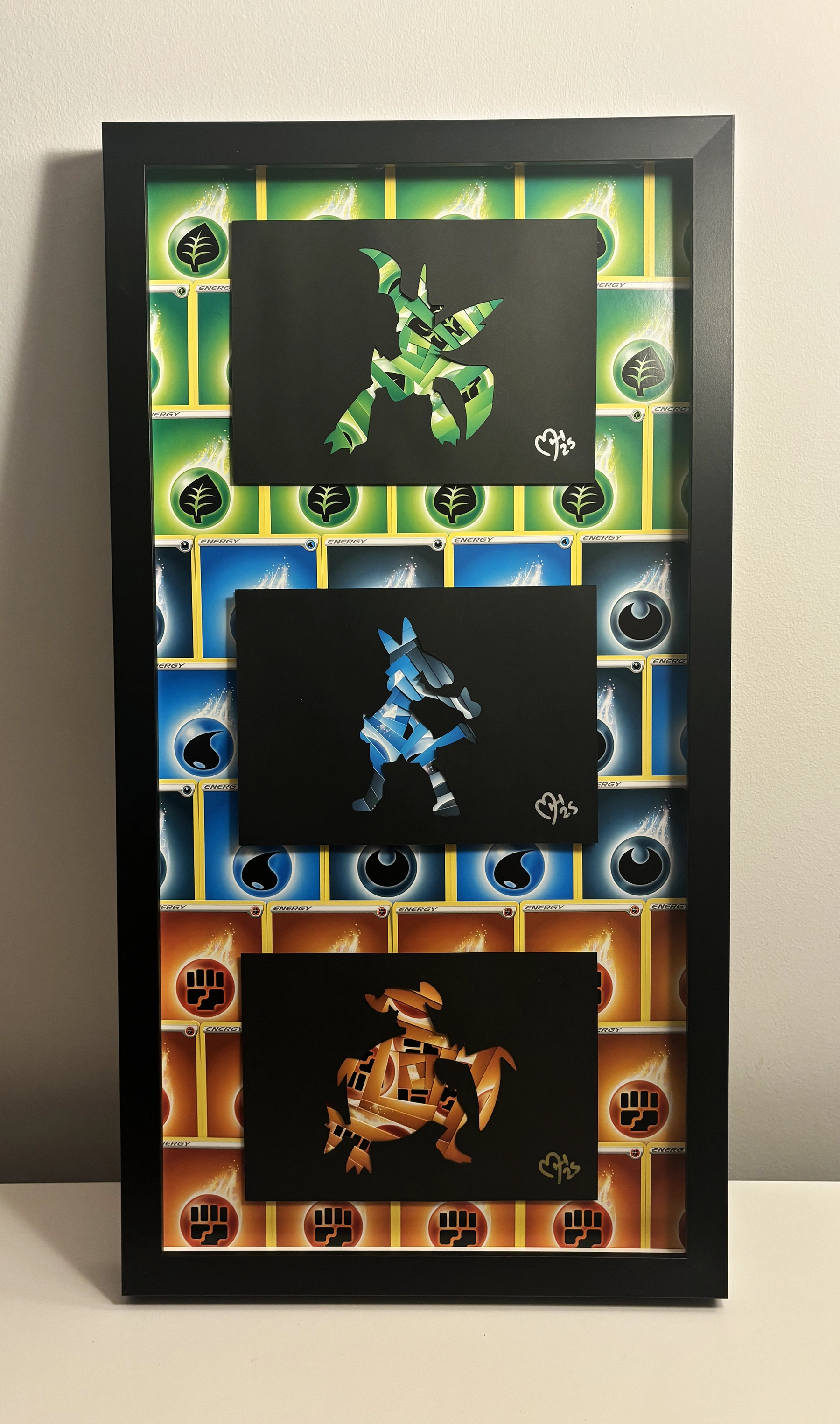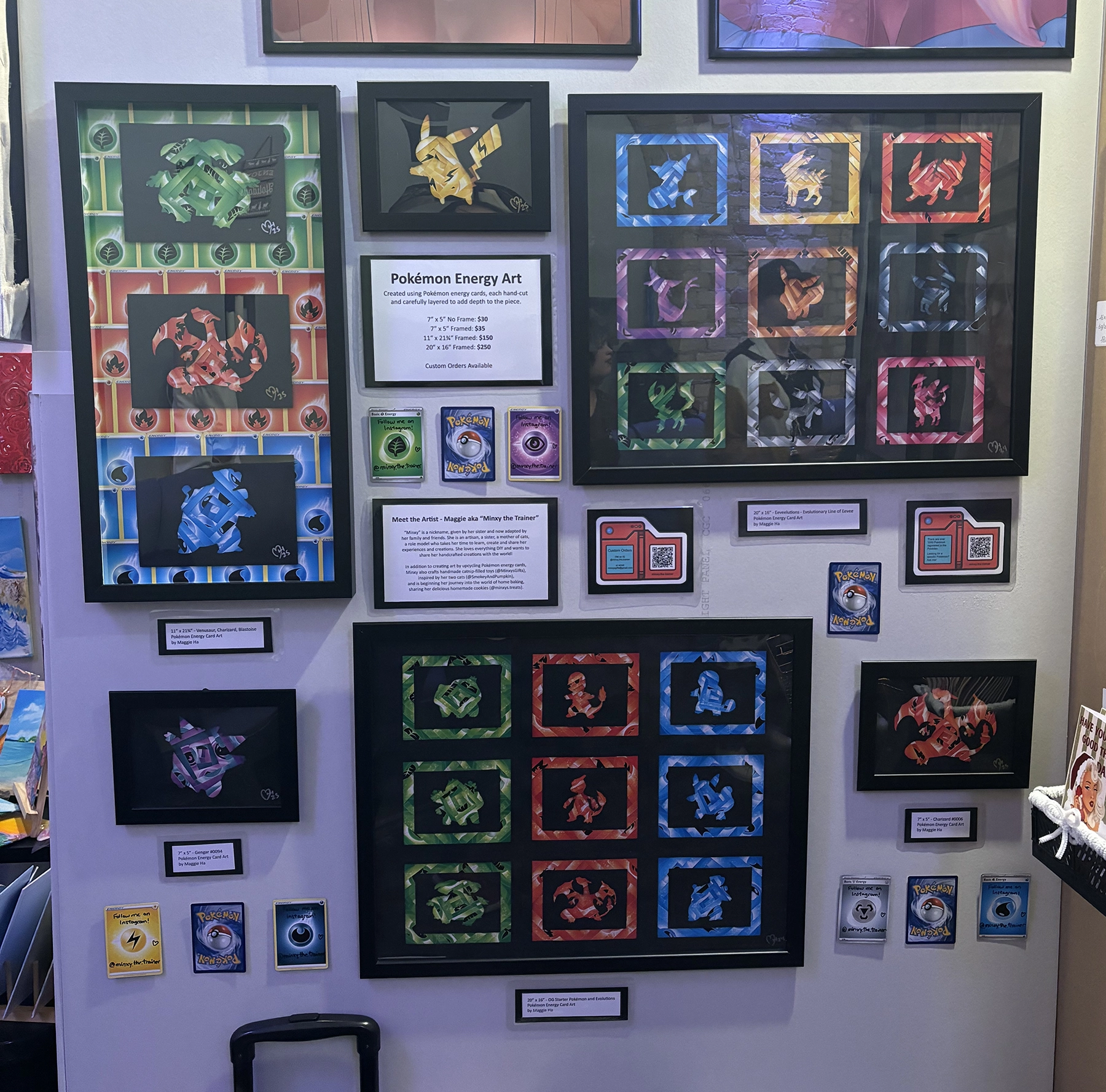 Minxy the Trainer creates art pieces using Pokémon energy cards, each hand-cut and carefully layered to add depth to the piece.