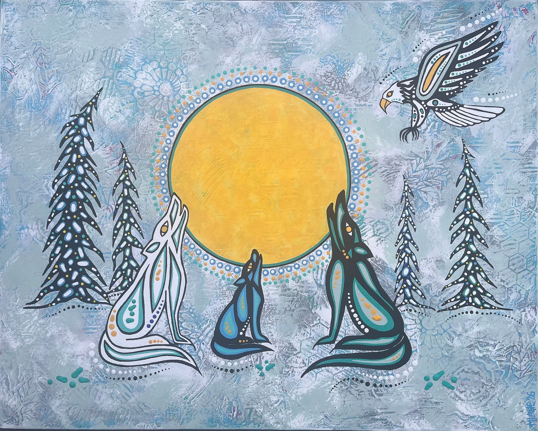 Miranda is a self-taught mixed media artist and spiritual intuitive. You can find her painting and creating from her home studio in Watson Lake, Yukon, or from her cabin the Owl’s Nest, on the Campbell Highway, Yukon.When she was a child, her grandfather, Medicine Man, Little Jimmy Doctor, shared the importance of animal medicine and the value of our interconnectedness with all beings and Mother Earth. These teachings have greatly influenced and contributed to Miranda’s work. She describes herself as someone who paints and creates intuitively from her heart, capturing the gifts of Mother Earth and sharing animal medicine to help others on their earth journey. Miranda was born into the Wolf Clan of the Kaska-Liard First Nation from the Yukon. She enjoys spending time with her husband Doug and their 2 sons Joshua and Jeremiah hiking in the woods, by lakes or rivers or in the mountains. She enjoys outdoor adventures, searching for rocks and feathers with family.