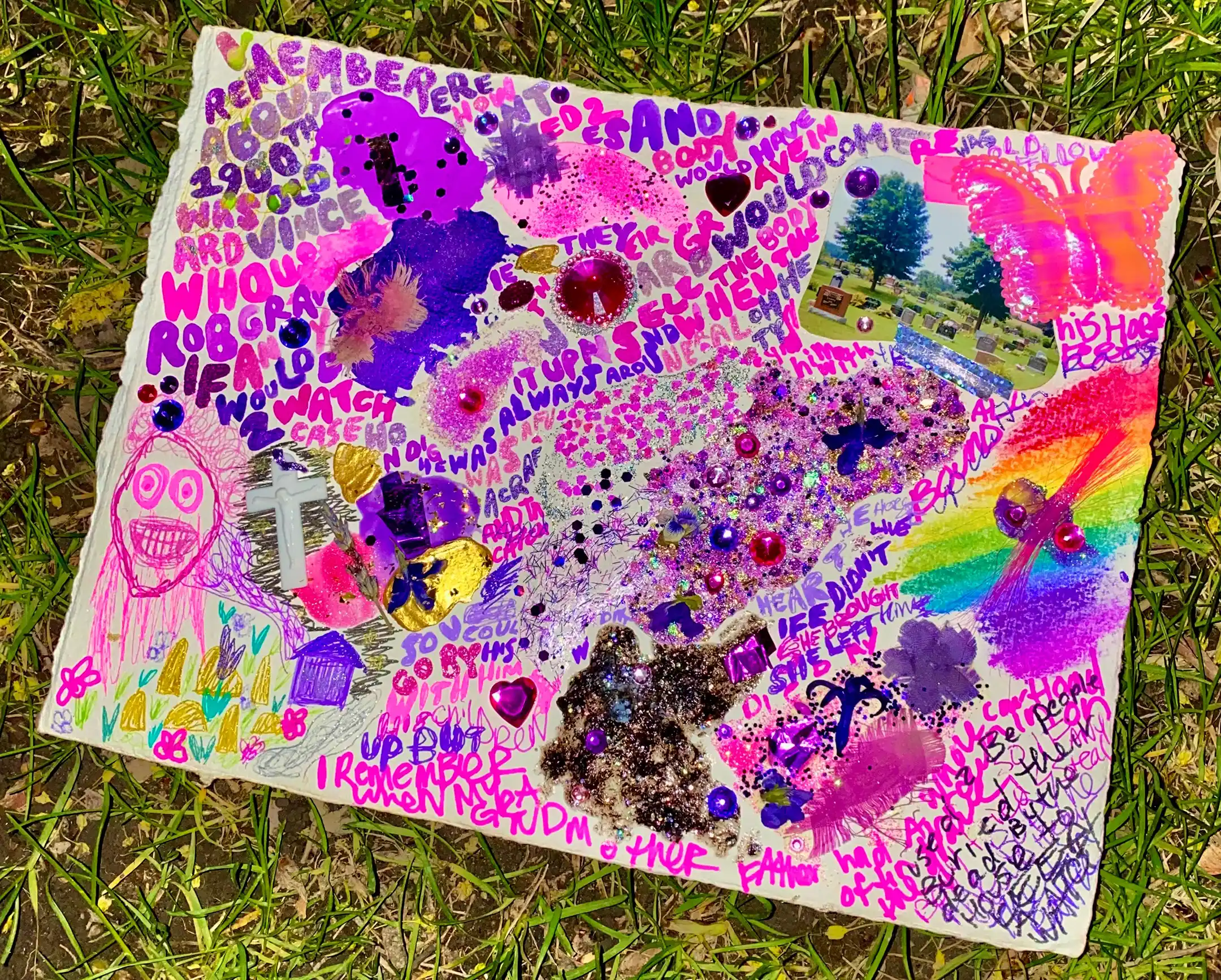 I am a mixed media artist whose work includes mosaics, fabric collage, and found object compositions. My work explores themes like politics, womanhood, rural upbringing and the St. Lawrence Seaway and its history which is both personal and political to me. Everything I do has a rainbow, pink and purple colour palette with lots of sparkle, and I often use words from my journal for background filler. The bright, girly colours usually directly contrast the text that goes with each piece, which often contain darker narratives. Everything is about juxtapositions; although the colour palette is feminine and child-like, the words are often sad or angry, and the found objects are primarily ones which have been discarded or lost, which I then find on the street.