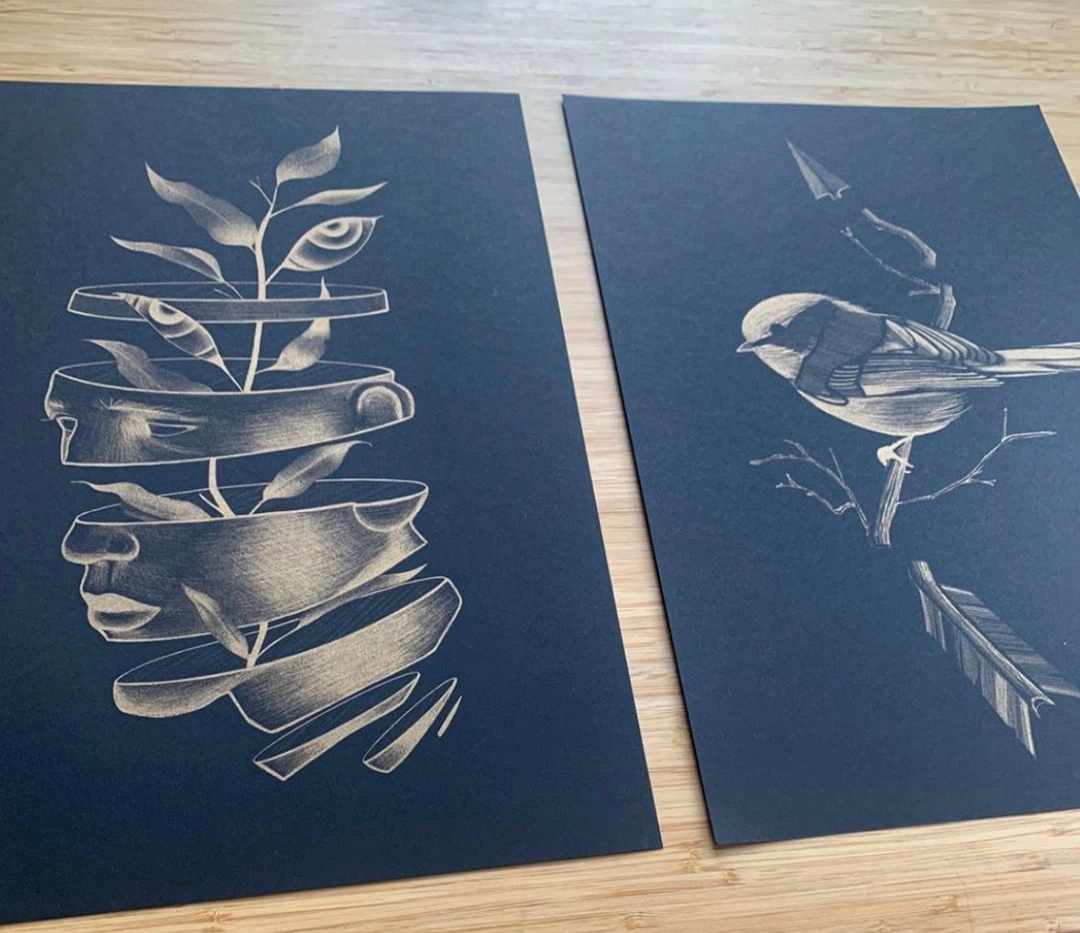 A tattoo artist of seven years dipping his toes into the fine art world. With Cree indigenous roots, a business degree, and an intensive tattoo mentorship for several years abroad in the Netherlands, I'm always walking the line between creating something completely new or reinventing iconic imagery within a introspective and contemporary lens.