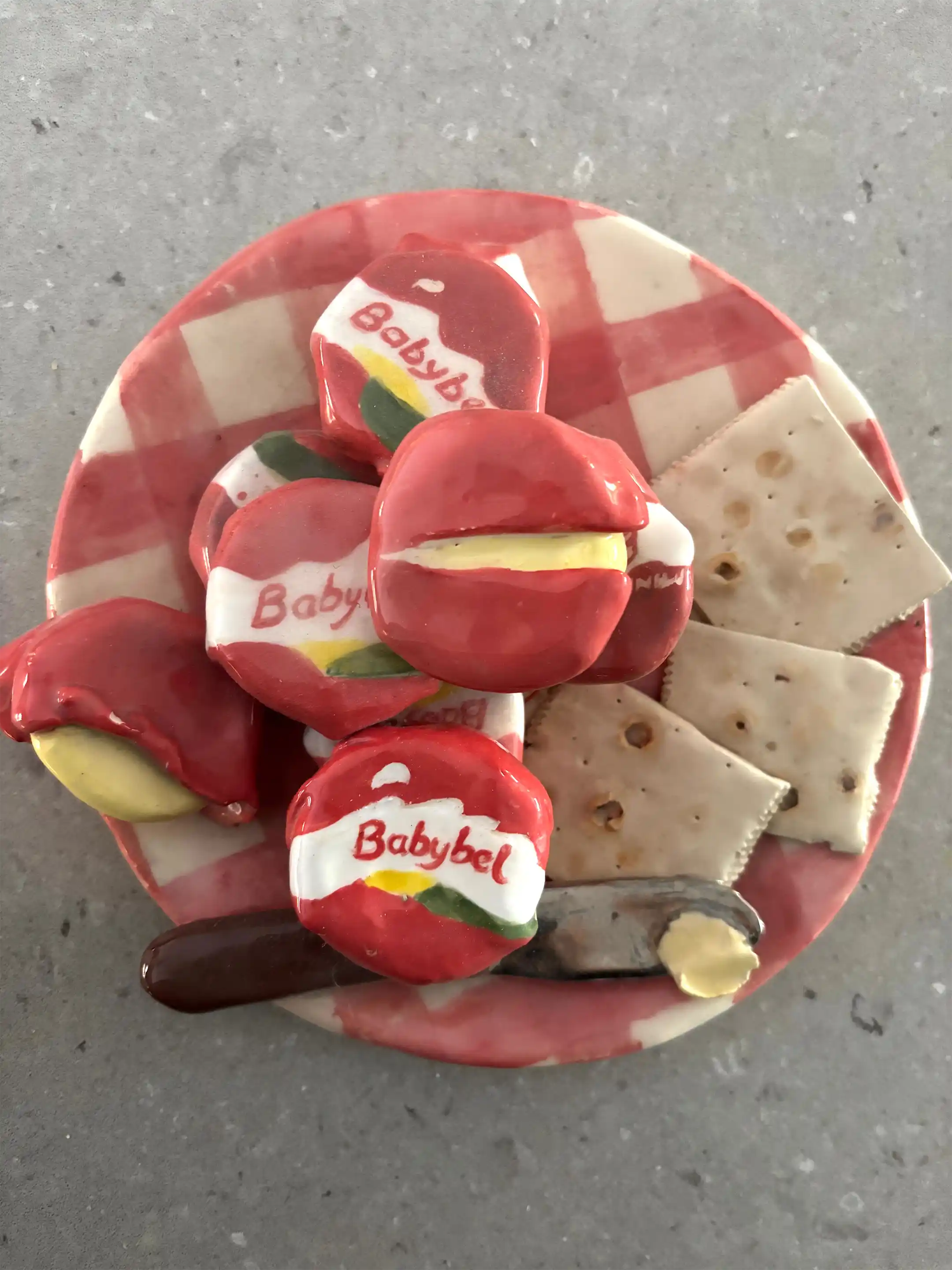 I love to create ceramic pieces from the ordinary everyday, with humour and realism. For eg I’ll make a plate of lemons with pips and slices or a plate of babybel cheese and crackers or a toilet roll out of paper on a holder, matches, sushi plates or a cloth with mushrooms, garlic and tomatoe paste