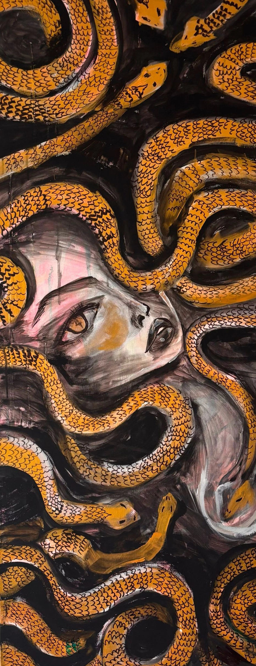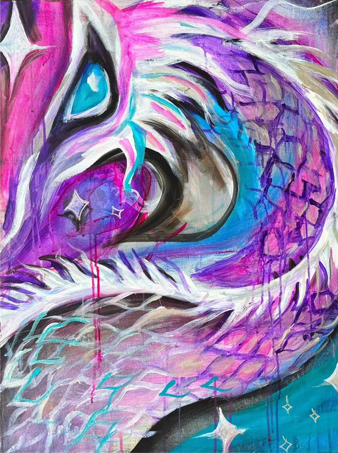 My name is Tay Noelle, and I am bringing my vision to life as an artist. I create traditional art, working primarily in acrylic, with an emerging focus on both Japanese watercolours and oil painting.My work is bold, vibrant, and dreamlike. It is centered around surreal portraiture and mystical forms. I create paintings that explore transformation, blending feminine forms with otherworldly elements. Through the use of bold line-work, high contrast, and vivid and limited color palettes, I create a world where beauty and darkness can coexist.I have been creating art on and off my entire life, but only really started devoting my life to creating art after significant vision loss in 2023. I use that remaining vision to create art. It took me losing my eyesight, to find my vision as an artist.I create art as an act of resilience, to challenge the limitations that society places on those with disabilities, and to inspire the world to do what they love, no matter what.