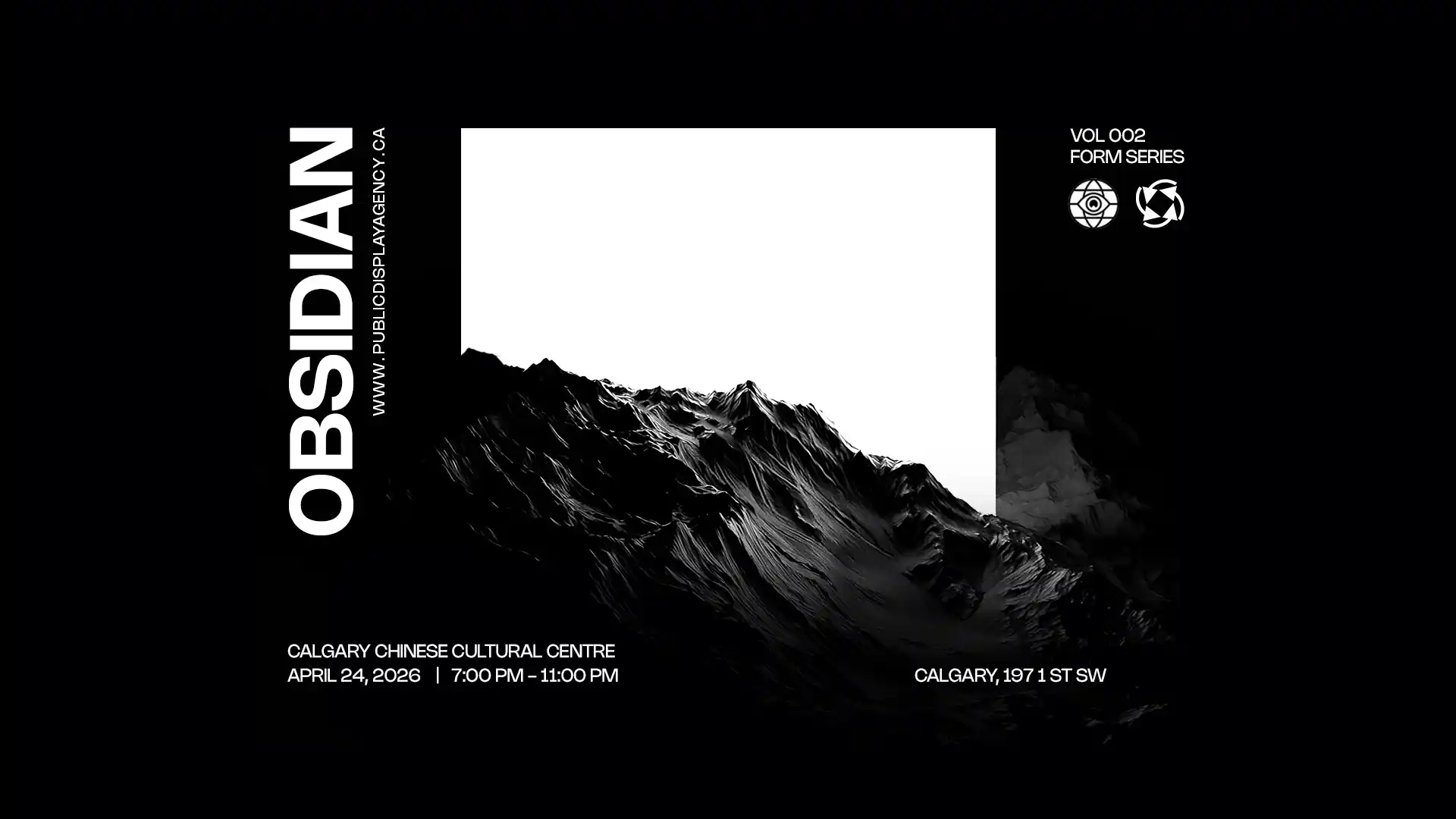 OBSIDIAN is a FORM event — a curated art experience by Public Display Agency that blends design, dialogue, and discovery. This one-night showcase unites visual artists, designers, and makers in an immersive, gallery-style setting at the Calgary Chinese Cultural Centre. OBSIDIAN invites guests to slow down, engage, and experience art in a new way. Admission is RSVP-based and pay-what-you-want, making it accessible while supporting artists directly. We believe art helps people find meaning, belonging, and community. Through events like OBSIDIAN, Public Display Agency brings artists and audiences together to feel seen, supported, and part of something bigger.