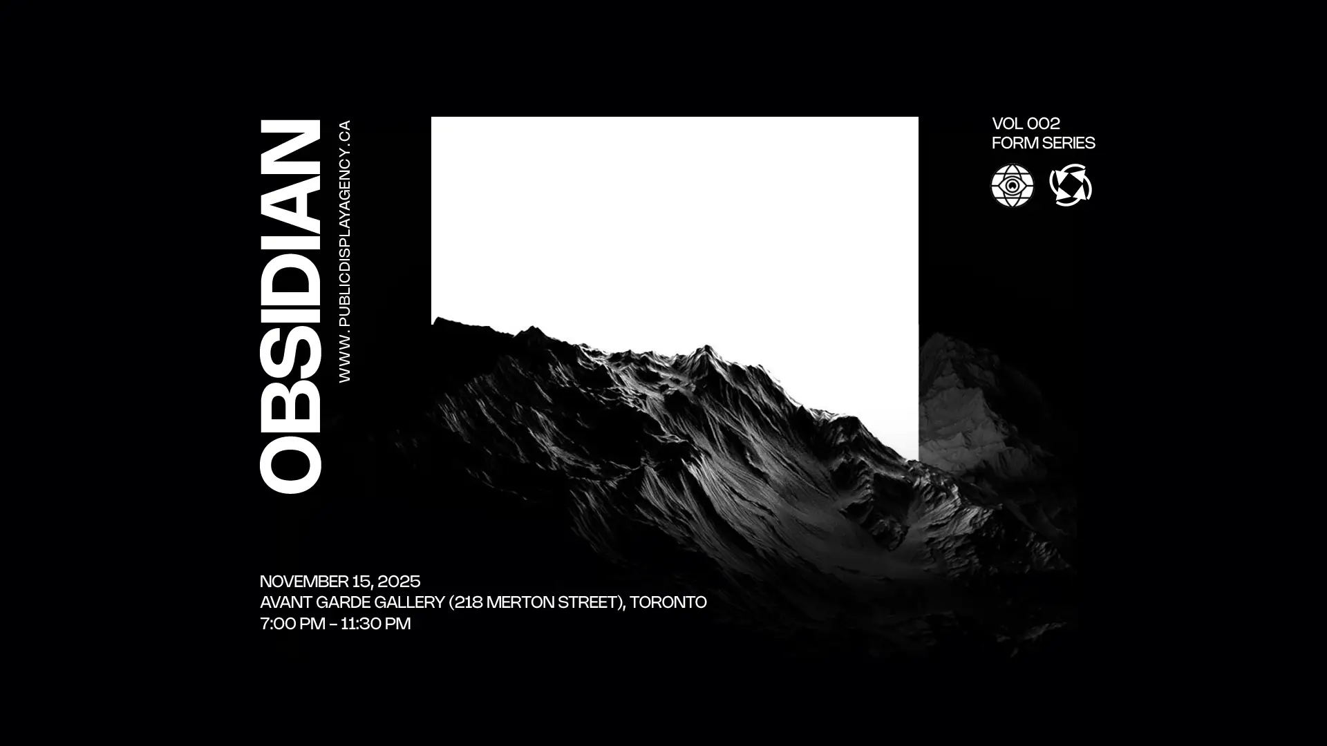 OBSIDIAN is a FORM event, part of Public Display Agency’s newest format: a curated art experience designed for meaningful engagement and elevated presentation. This one-night-only event brings together a carefully selected group of visual artists, designers, and makers in a gallery-inspired environment. Instead of performances or runway shows, OBSIDIAN features interactive installations, immersive layouts, and intentional staging that invite dialogue, reflection, and connection. Set within the contemporary space of Avant Garde Gallery, OBSIDIAN offers room to slow down, take in the work, and engage with artists in a focused, design-driven atmosphere. If you’re looking to experience art in a new way, OBSIDIAN is where it begins.